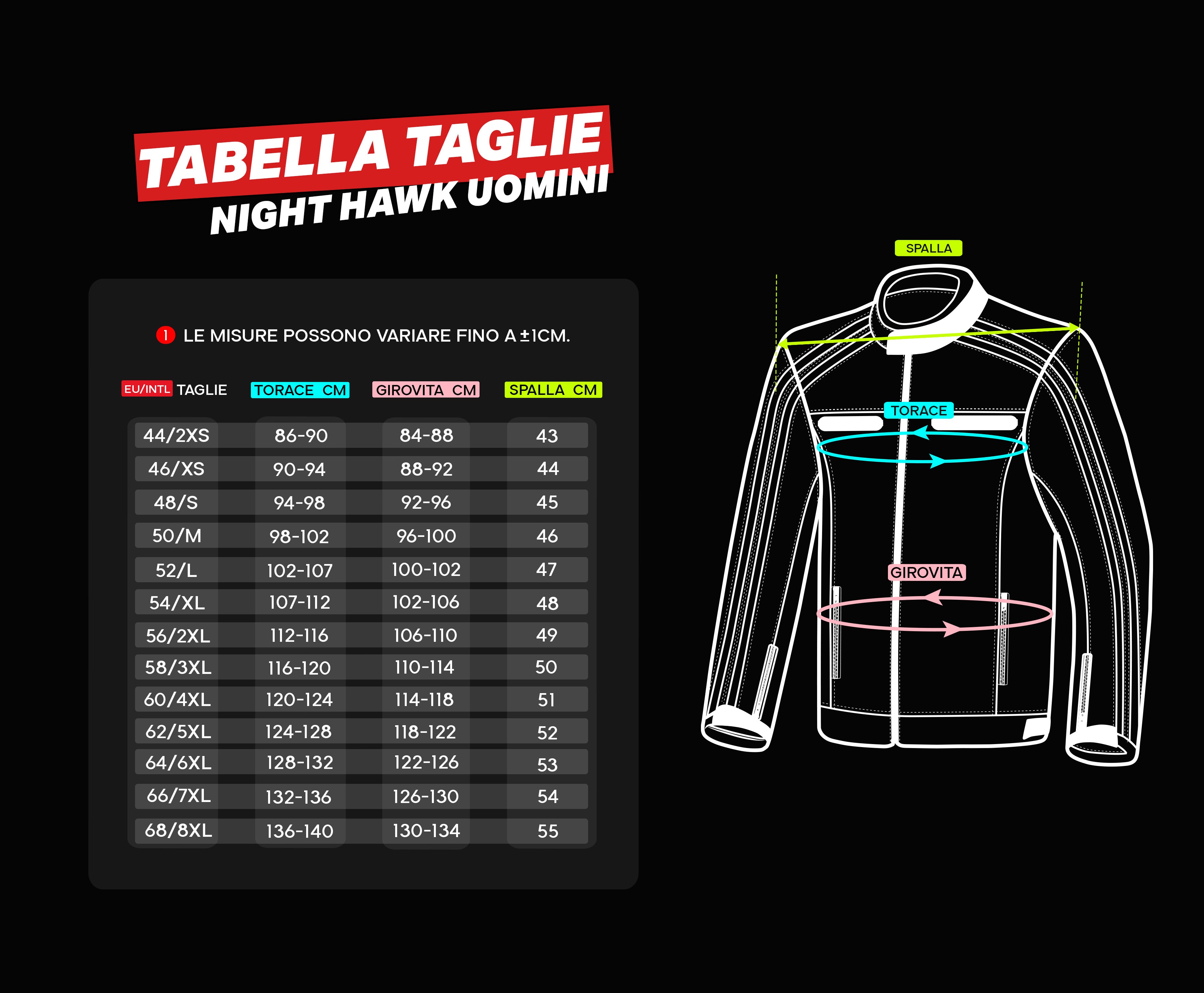 Disponibile in diverse taglie dalla 46 alla 62 (taglie EU). Consulta la nostra tabella taglie per le misure precise e il fitting corretto