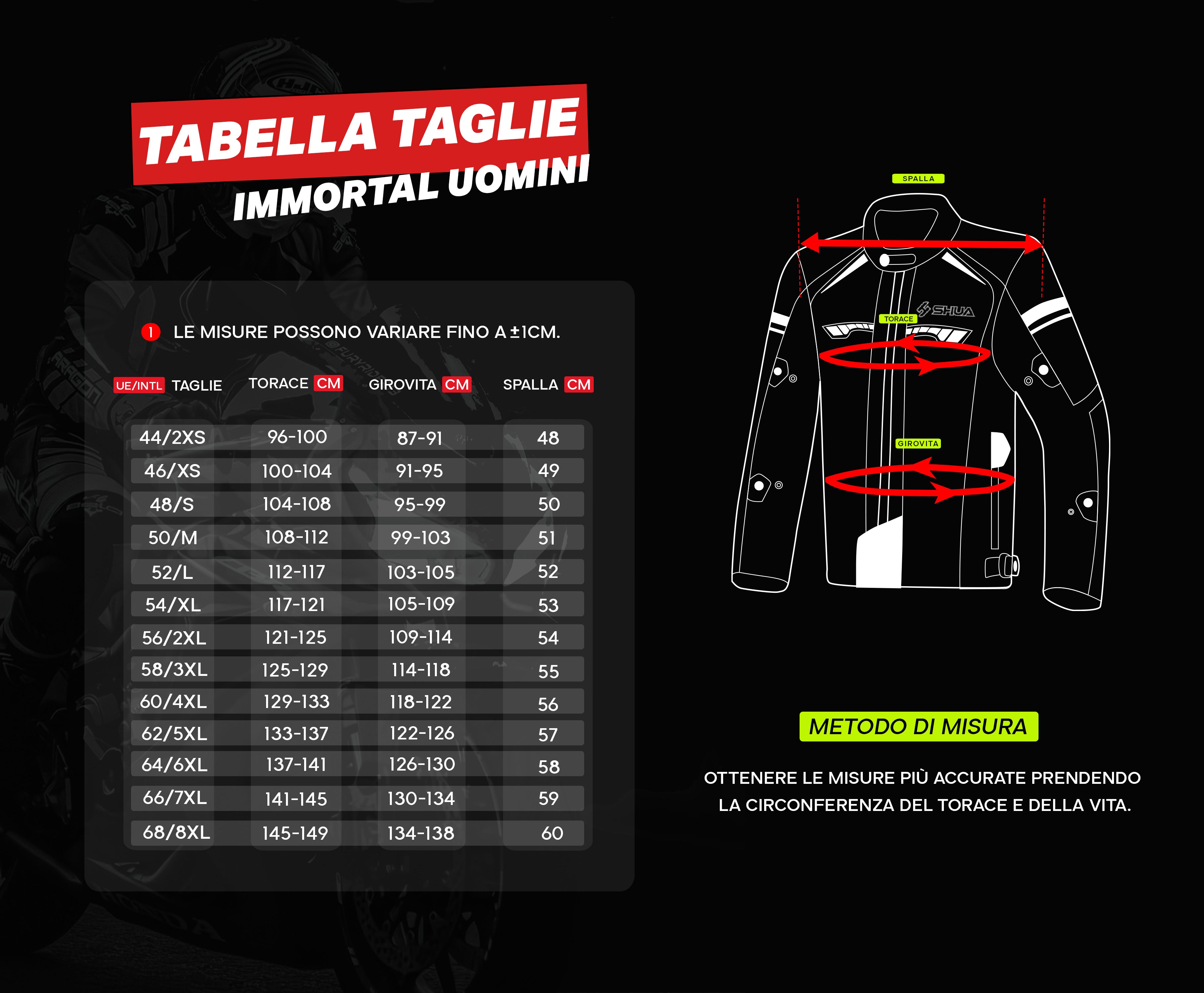La Shua Immortal è certificata secondo la norma EN 17092-4:2020, con una valutazione CE di Classe A. Progettata per garantire sicurezza e durata, questa giacca è dotata di un morbido colletto in neoprene che garantisce un comfort a contatto con la pelle. La chiusura frontale con cerniera YKK e velcro garantisce una vestibilità sicura. È inoltre dotata di una cerniera di collegamento corta che consente di collegarla ai pantaloni da moto Shua per ottenere un insieme di due pezzi.